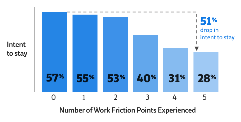 According to Gartner's data, experiencing just 5 work friction points can reduce an employee's intent to stay by more than half.